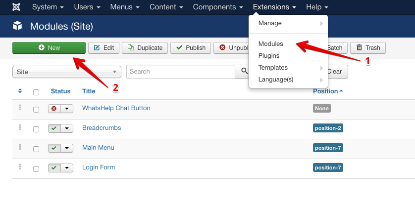 - Go to "Extensions" → "Modules" . If the GetButton plugin is not in the list, click "New" button on the top left and choose the GetButton Chat Button plugin from the list. If the plugin appears in the list, click on it and visit plugin setting page.